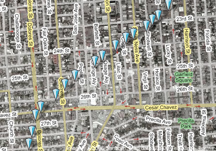 I've made two of these Urban Palimpsests, as I'm calling them, using Platial. The first (on the left, above, of the SOMA area of San Francisco, where I used to have an office. The second is of the area that Jim talked about, tracing the path of a big rail spur through much of the Mission.